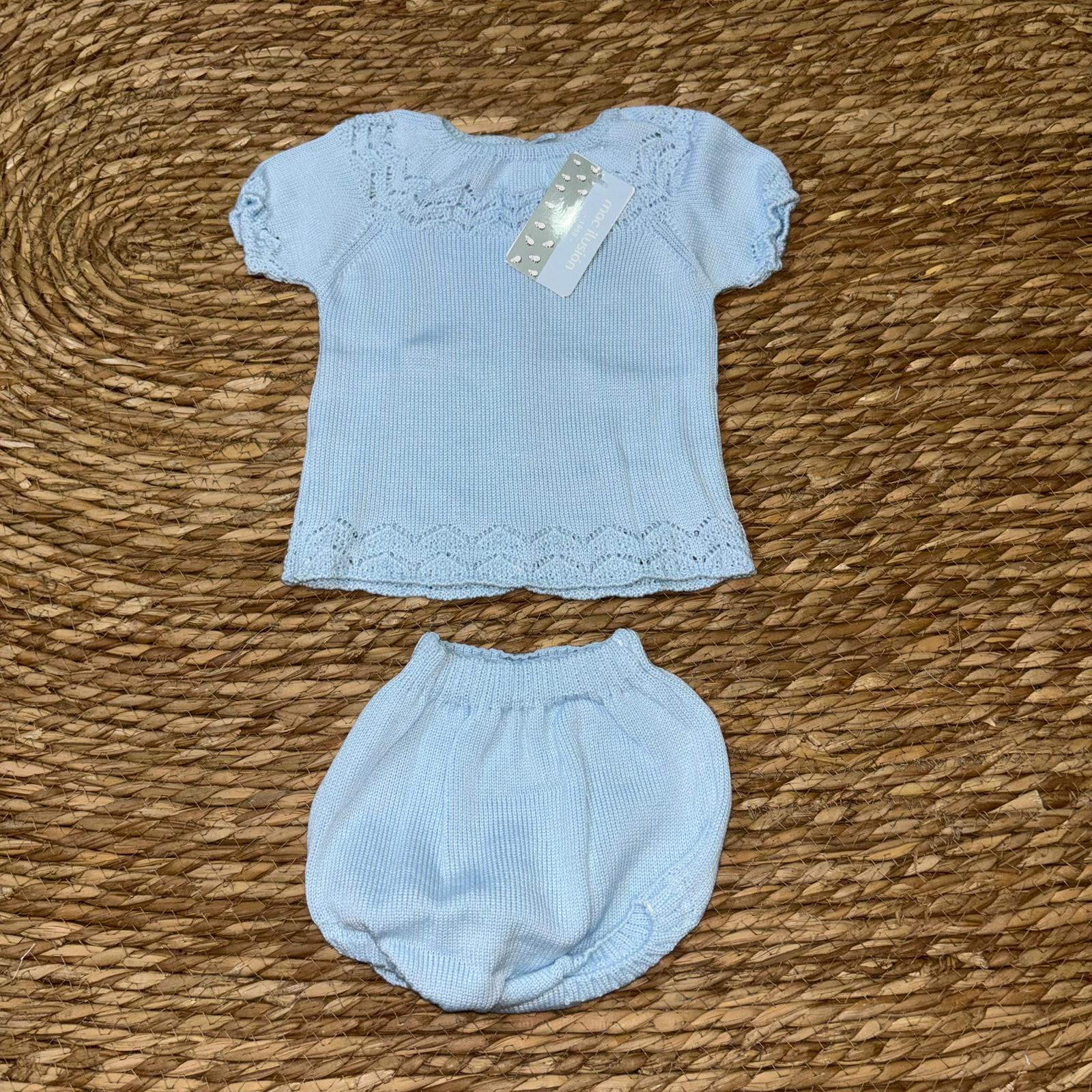 Conjunto de pantalón de tela celeste de rayas blancas y blusa perforada con lazos de adorno