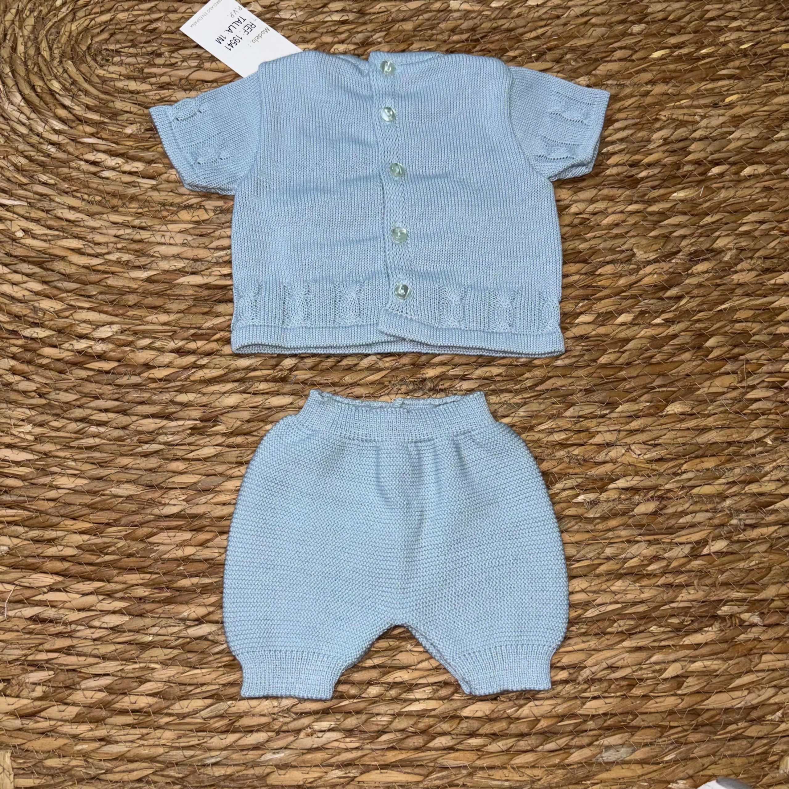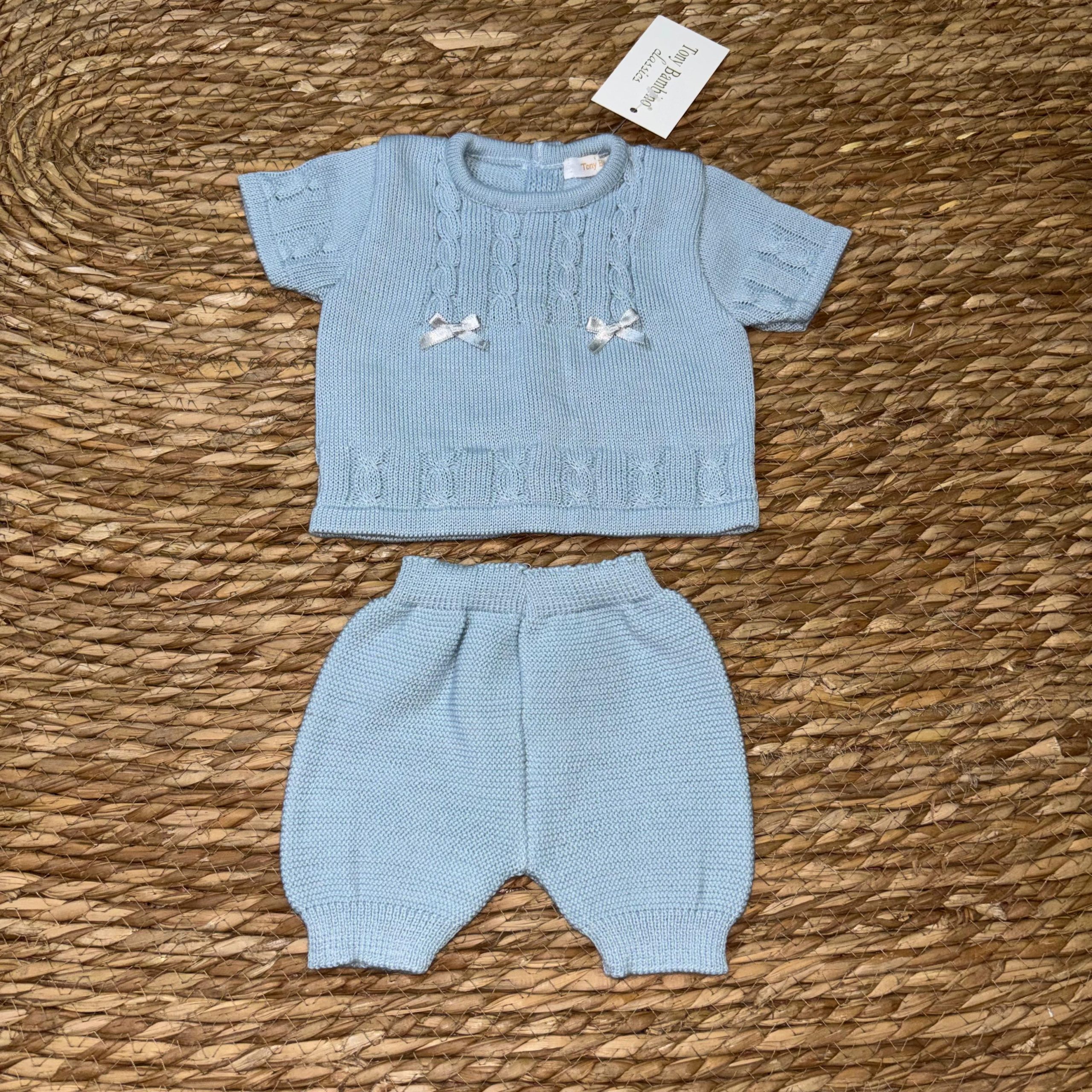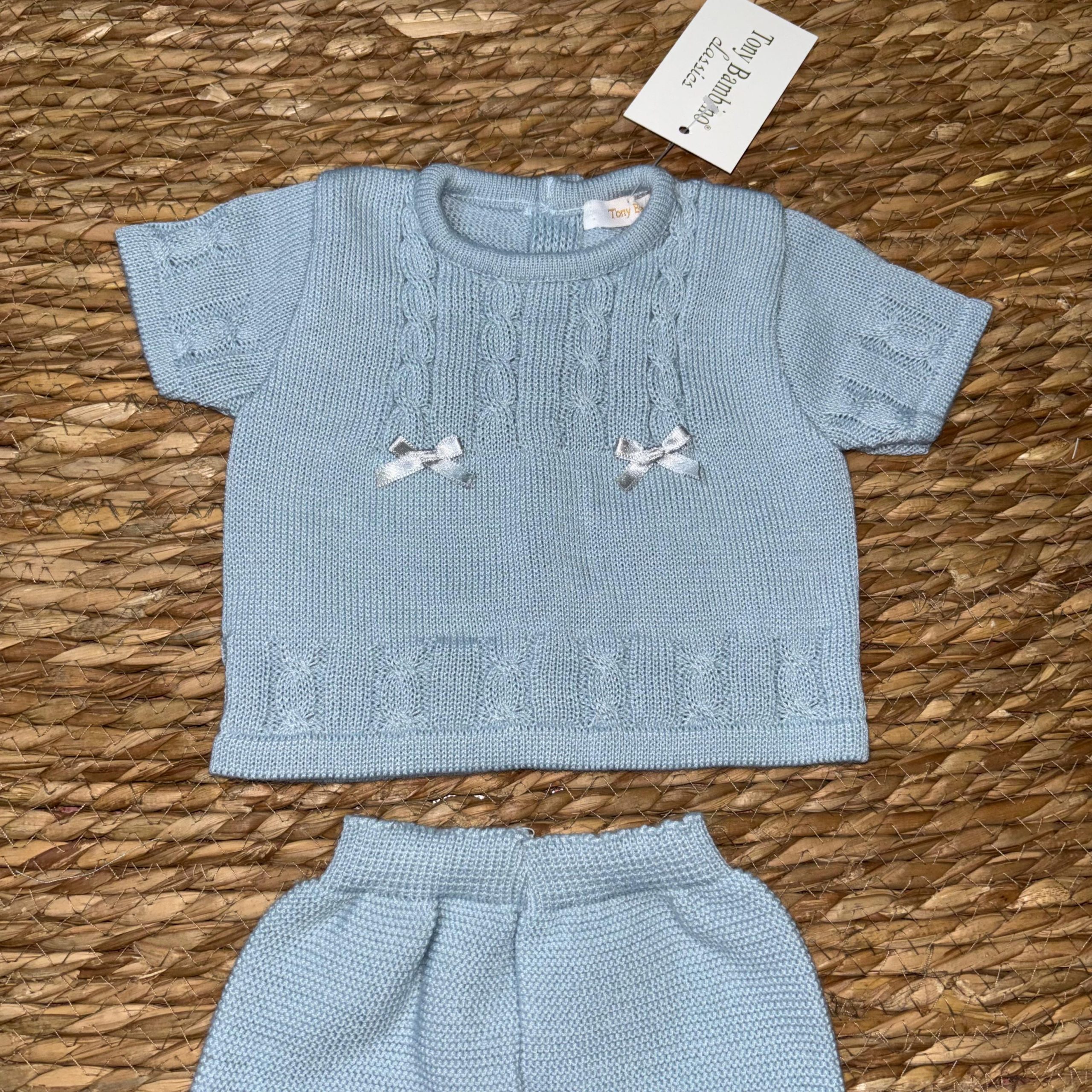 Conjunto 19541. Conjunto celeste entero con el adorno de dos lacitos en la parte delantera. Chaleco abotonado en la parte de la espalda